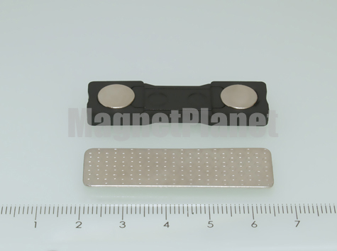 2 darab NEODYM mágnes korong és egy polírozott fém lap, mellyel ruhán, 2-3 mm vastag anyagon rögzíthető egy néhány gramm súlyú kitüző, azonosító, jelölő kártya.